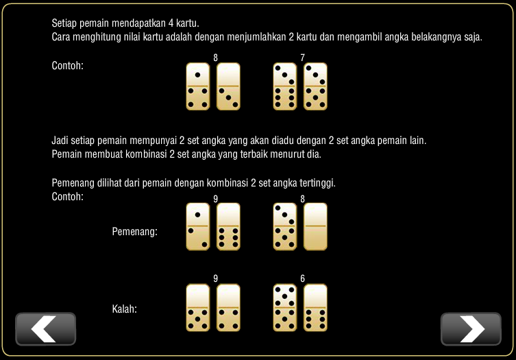 • Pemain Domino KIU-KIU akan di berikan 4 kartu, dan nilai kartu yang tertinggi akan menjadi pemenangnya